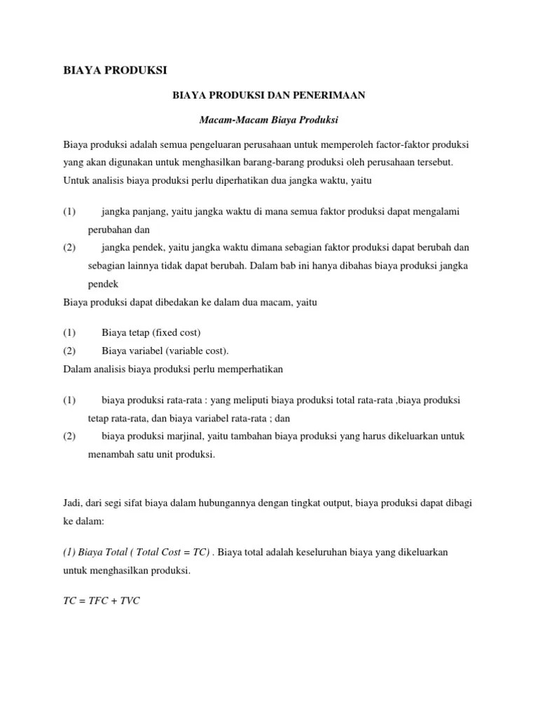 12 beberapa pengertian biaya produksi … 01.10.2018 · biaya total (total cost/ tc), yaitu total seluruh biaya tetap dan biaya variabel yang digunakan suatu perusahaan untuk menghasilkan barang jadi dalam satu periode tertentu. Contoh soal dan jawaban … Average cost akan dibandingkan dengan biaya tetap saat. 01.06.2019 · pengertian biaya produksi komponen jenis tetap variabel total rata rata marjinal perhitungan contoh ekonomi biaya produksi adalah sebagian keseluruhan faktor produksi yang dikorbankan dalam proses produksi untuk menghasilkan produk.